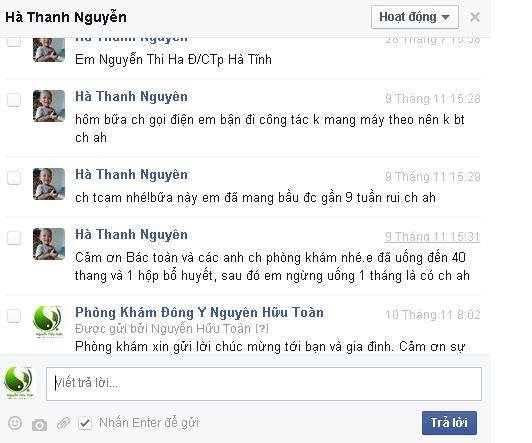 Cảm tưởng của Chị Hà Thị Thảo sn 1988 – Địachỉ Hoàng Mai – Hà NộiChị lập gia đình hơn 1 năm chưa có em bé, cả 2 vợ chồng chị đi kiểm trabác sĩ kết luận vô sinh không rõ nguyên nhân, kinh nguyệt đều, hau đau bụng kinh. Chị có tiền sử bị u nang buồng trứng, hay nóng trong, người gầy. Chồng chị bình tinh trùng yếu. Chị có gọi điện đến phòng khám Đông y Nguyễn Hữu Toàn, được bác sĩ tư vấn về bệnh và cách điều trị cho cả hai vợ chồng. Chị đã đồng ý lấy thuốc. Sau 2 đợt điều trị, chị đã thông báo có tin vui về cho phòng khám. Phòng khám xin gửi lời chúc tới chị cùng gia đình, chúc chị cùng gia đình luôn mạnh khỏe, hạnh phúc.